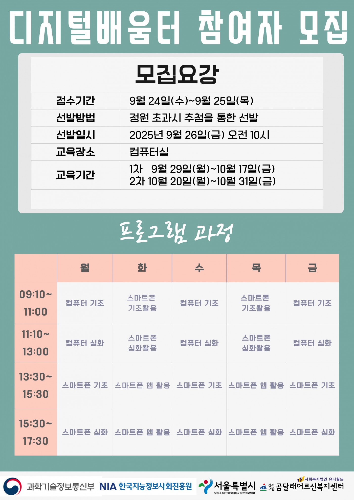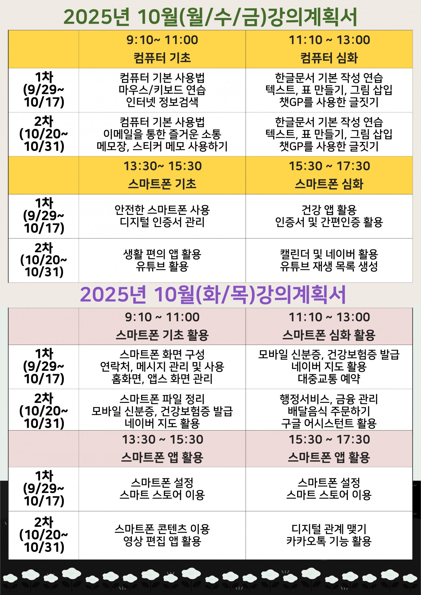 10월 디지털배움터 안내 페이지 정보 작성자 관리자 작성일2025-09-23 18:07 조회310회 관련링크 이전글 다음글 목록 본문 안녕하세요 곰달래어르신복지센터입니다.10월 디지털배움터 안내입니다. 이전글 다음글 목록