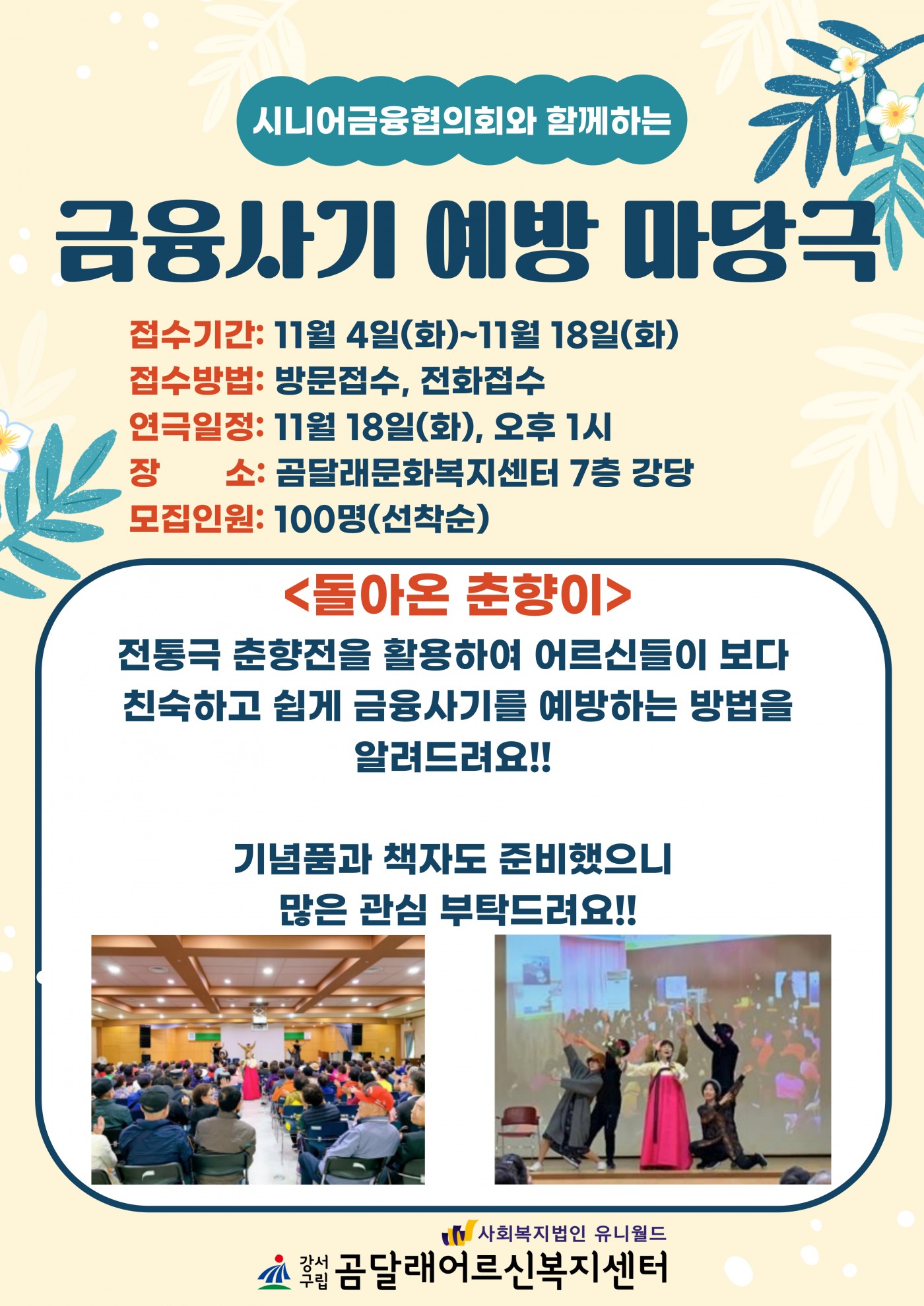 금융사기 예방연극 신청 안내 페이지 정보 작성자 관리자 작성일2025-11-04 11:38 조회3회 관련링크 다음글 목록 본문 안녕하세요 2025년 금융사기 예방연극 신청 안내입니다.많은 관심 부탁드리겠습니다. 다음글 목록