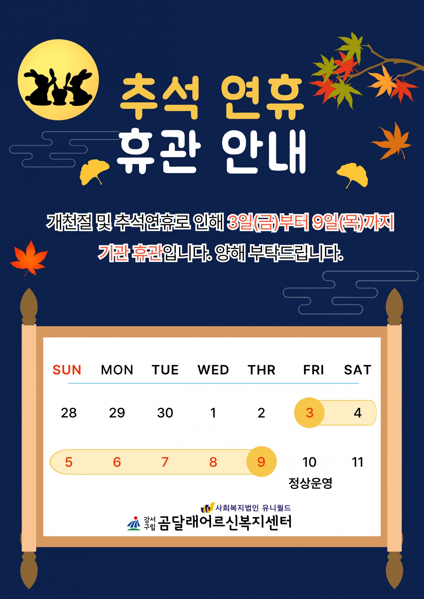 10월 휴관 안내입니다. 페이지 정보 작성자 관리자 작성일2025-09-26 17:32 조회150회 관련링크 다음글 목록 본문 10월 휴관 안내입니다.일정에 참고하시길 바랍니다.감사합니다. 다음글 목록