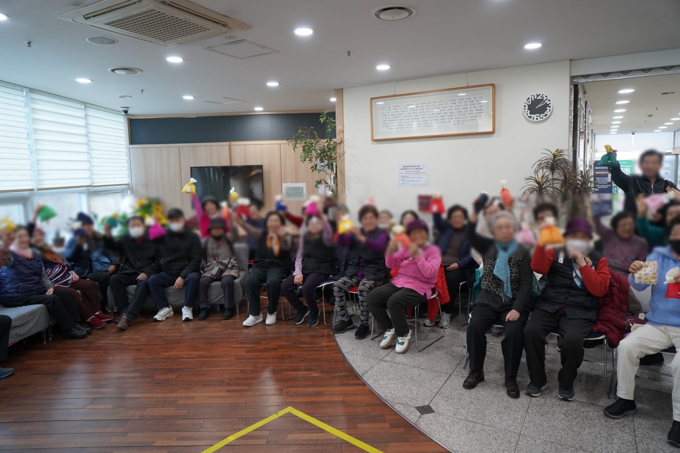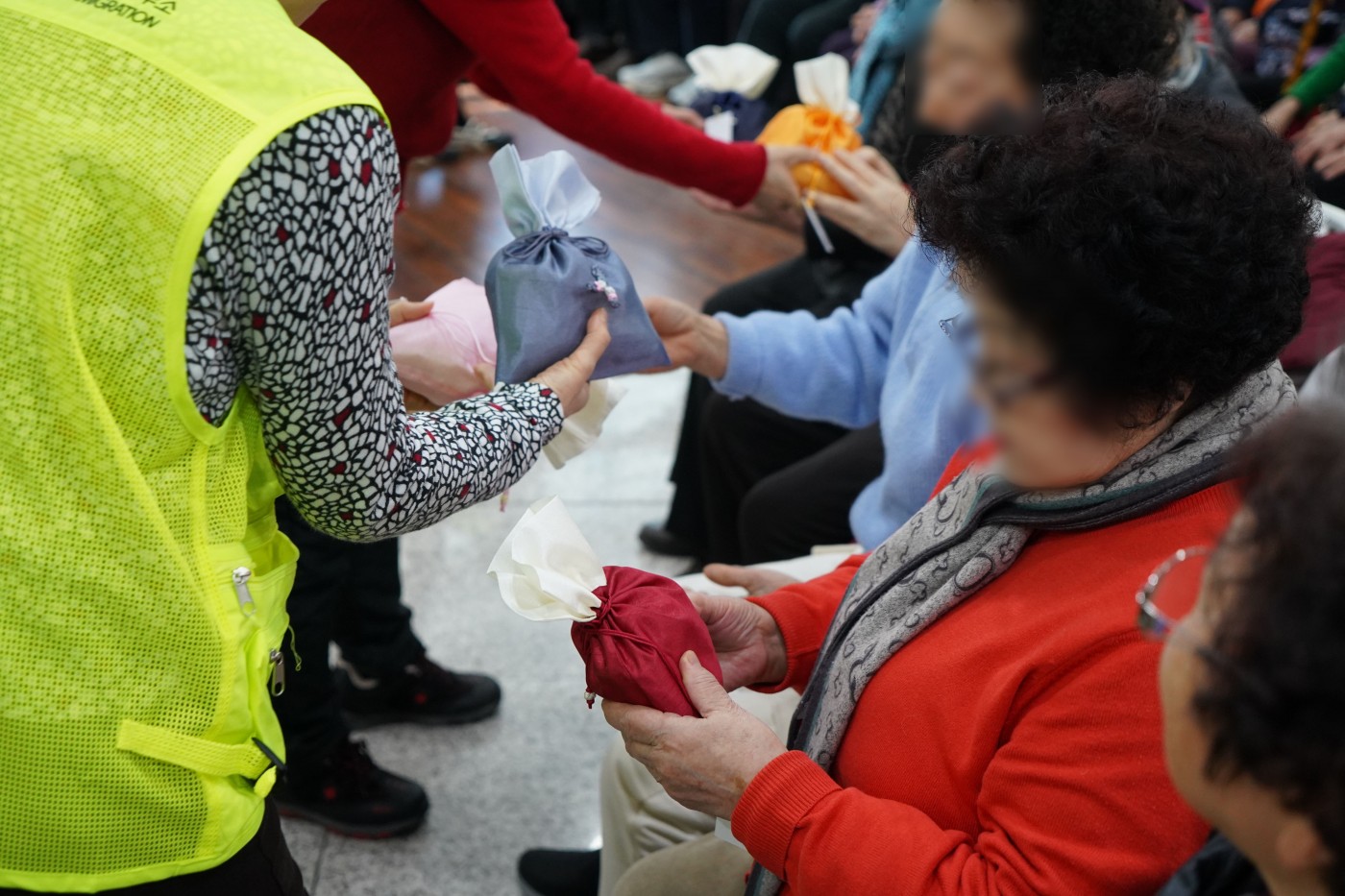 크고 알록달록한 복주머니에 어르신들께서는 환한 미소로 기뻐해 주셨으며, 달콤한 유과 간식은 명절의 따뜻한 분위기를 한층 더해 주었습니다.